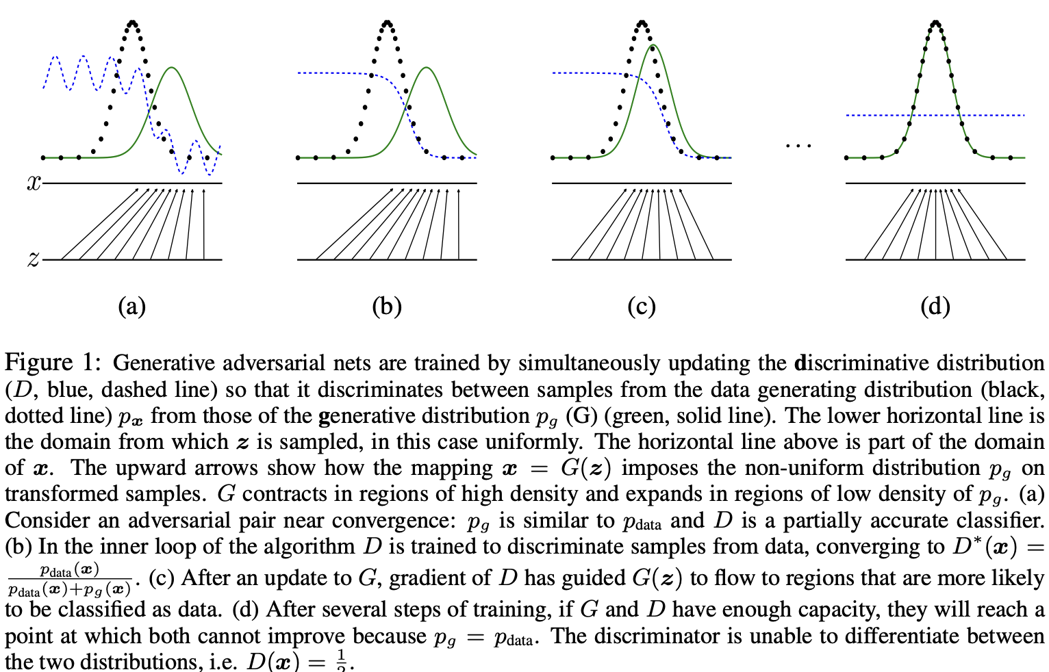 green은 G가 만든 data distribution임. 처음에는 조금 엉망이고, 학습하면서 점점 black을 닮아감.