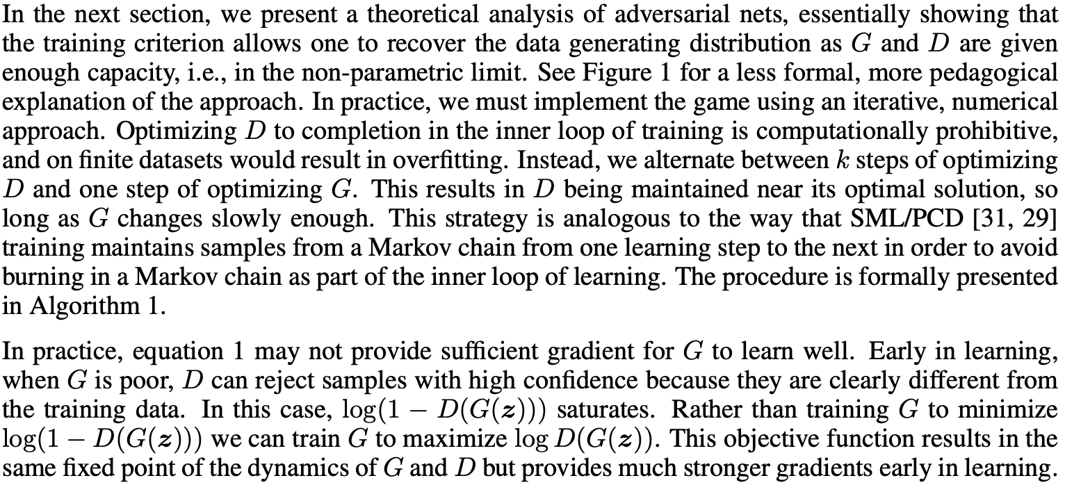 대신에, D를 k번 업데이트, G를 1번 업데이트하는 것을 반복함. → D가 항상 거의 최적 상태에 있도록 유지하지만 G가 너무 빠르게 변화하지 않게 유지하는 게 중요함.
