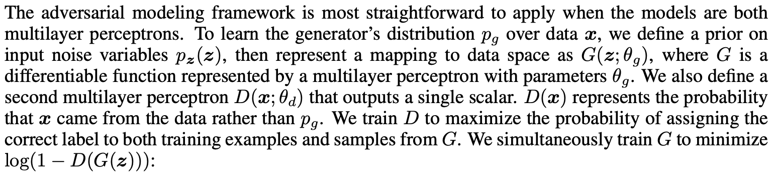 In this article, we explore the special case when the generative model generates samples by passing random noise through a multilayer perceptron, and the discriminative model is also a multilayer perceptron. → 생성 모델 G: 랜덤 노이즈 → MLP → 샘플 생성, 판별 모델 D: 입력 샘플 → MLP → 진짜일 확률 출력