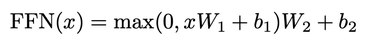 In addition to attention sub-layers, each of the layers in our encoder and decoder contains a fully connected feed-forward network, which is applied to each position separately and identically. → attention 말고도 FFN이 들어가 있는데, 각 토큰 위치(position)에 대해서 서로 독립적으로(separately) 적용되고 모든 위치에서 같은 함수(identically)를 사용함. 같은 위치에서는 같은 parameter가 공유되지만 layer 사이에는 다른 parameter가 공유됨.