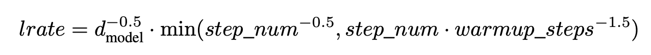 Optimizer를 다음과 같이 적용함. Adam 옵티마이저 사용. → 학습률은 고정은 아니지만, step에 따라 변함. → 초반 4000 step은 선형 증가(warmup). → 이후에는 1/√step로 감소. → 모델 차원(d_model)이 클수록 학습률은 작게 조정.