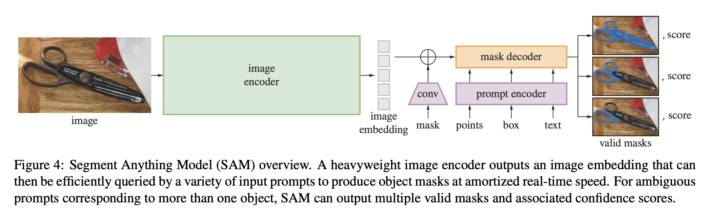 By separating SAM into an image encoder and a fast prompt encoder / mask decoder, the same image embedding can be reused (and its cost amortized) with different prompts. → SAM을 image encoder와 fast prompt encode/mask decoder로 나누면, 같은 이미지 임베딩을 다양한 prompt에 재사용할 수 있고, 그 비용을 분산시킬 수 있음.