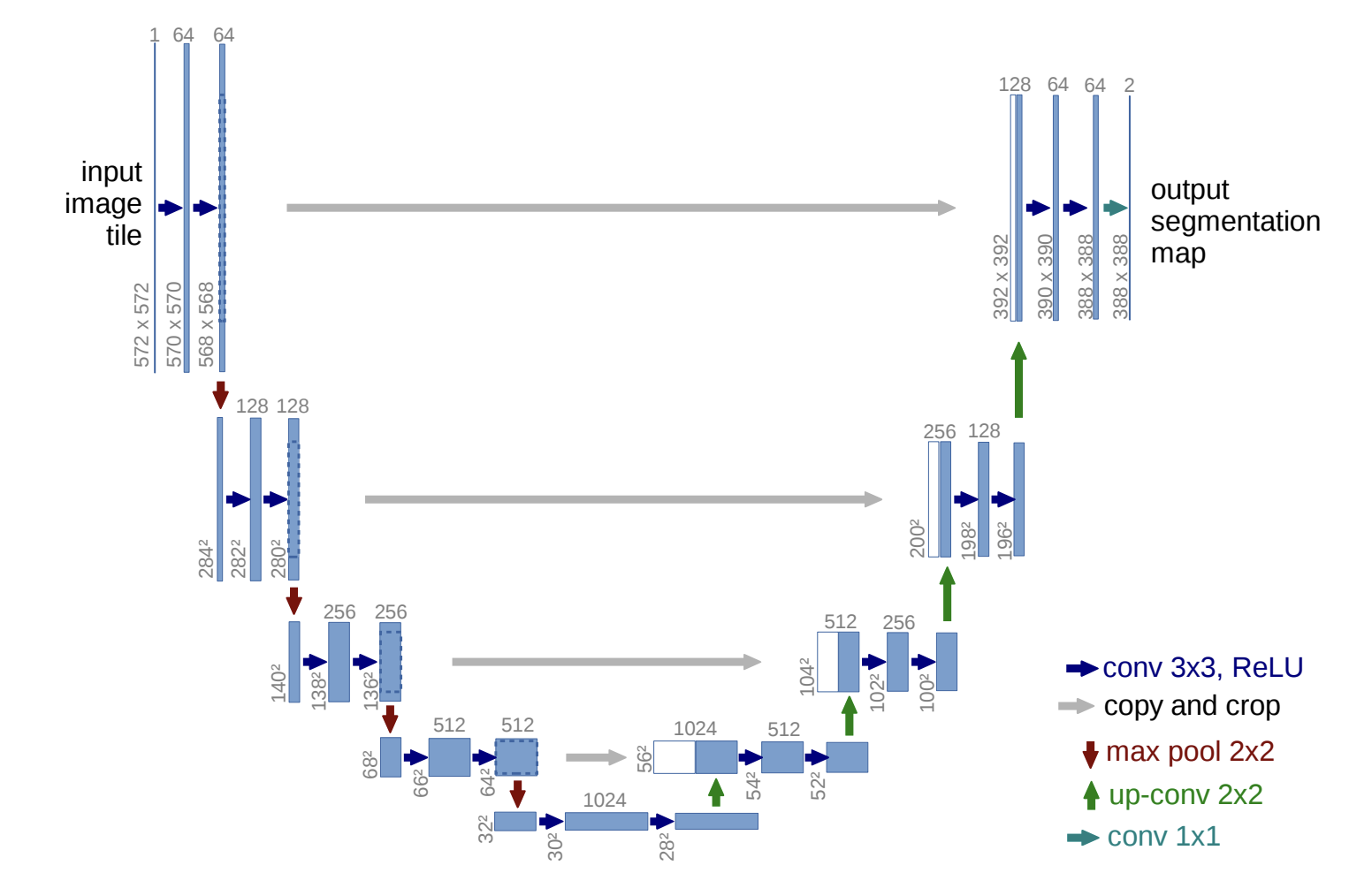 The network architecture is illustrated in Figure 1. It consists of a contracting path (left side) and an expansive path (right side). The contracting path follows the typical architecture of a convolutional network. It consists of the repeated application of two 3x3 convolutions (unpadded convolutions), each followed by a rectified linear unit (ReLU) and a 2x2 max pooling operation with stride 2 for downsampling. At each downsampling step we double the number of feature channels. Every step in the expansive path consists of an upsampling of the feature map followed by a 2x2 convolution (“up-convolution”) that halves the number of feature channels, a concatenation with the correspondingly cropped feature map from the contracting path, and two 3x3 convolutions, each followed by a ReLU. The cropping is necessary due to the loss of border pixels in every convolution. At the final layer a 1x1 convolution is used to map each 64- component feature vector to the desired number of classes. In total the network has 23 convolutional layers. To allow a seamless tiling of the output segmentation map (see Figure 2), it is important to select the input tile size such that all 2x2 max-pooling operations are applied to a layer with an even x- and y-size.